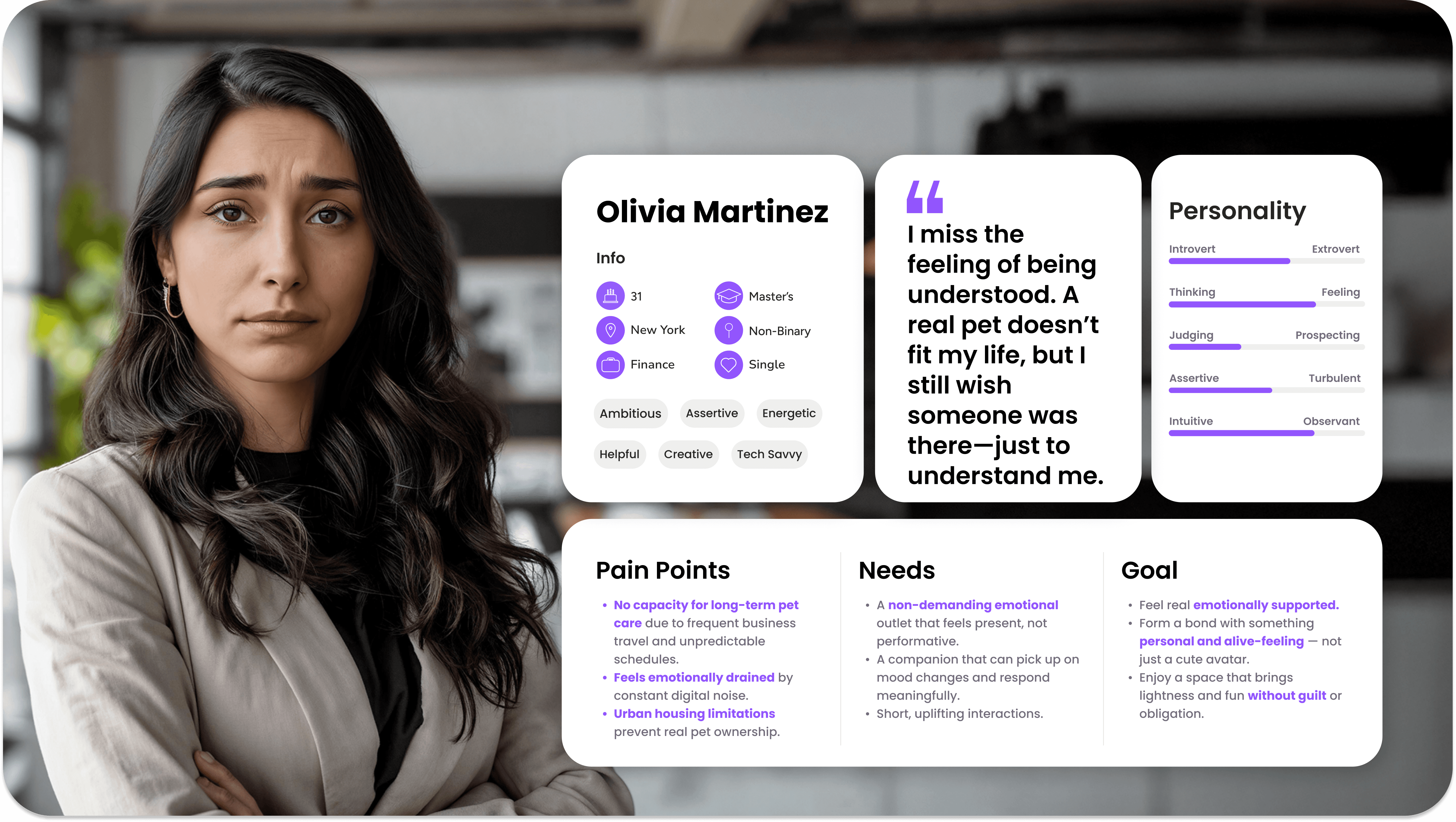 To better understand how people perceive companionship, emotional comfort, and virtual pets, I conducted in-depth interviews with participants living alone or experiencing emotional distance in their daily routines.