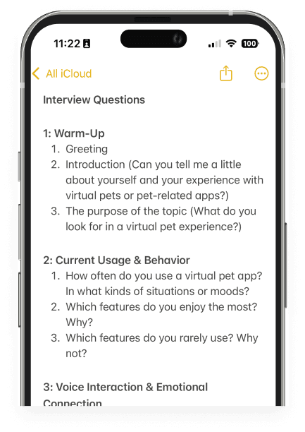 Before conducting user interviews, I formulated the following hypotheses to guide my research. These assumptions focused on emotional connection, engagement patterns, and the role of AR in shaping companionship.